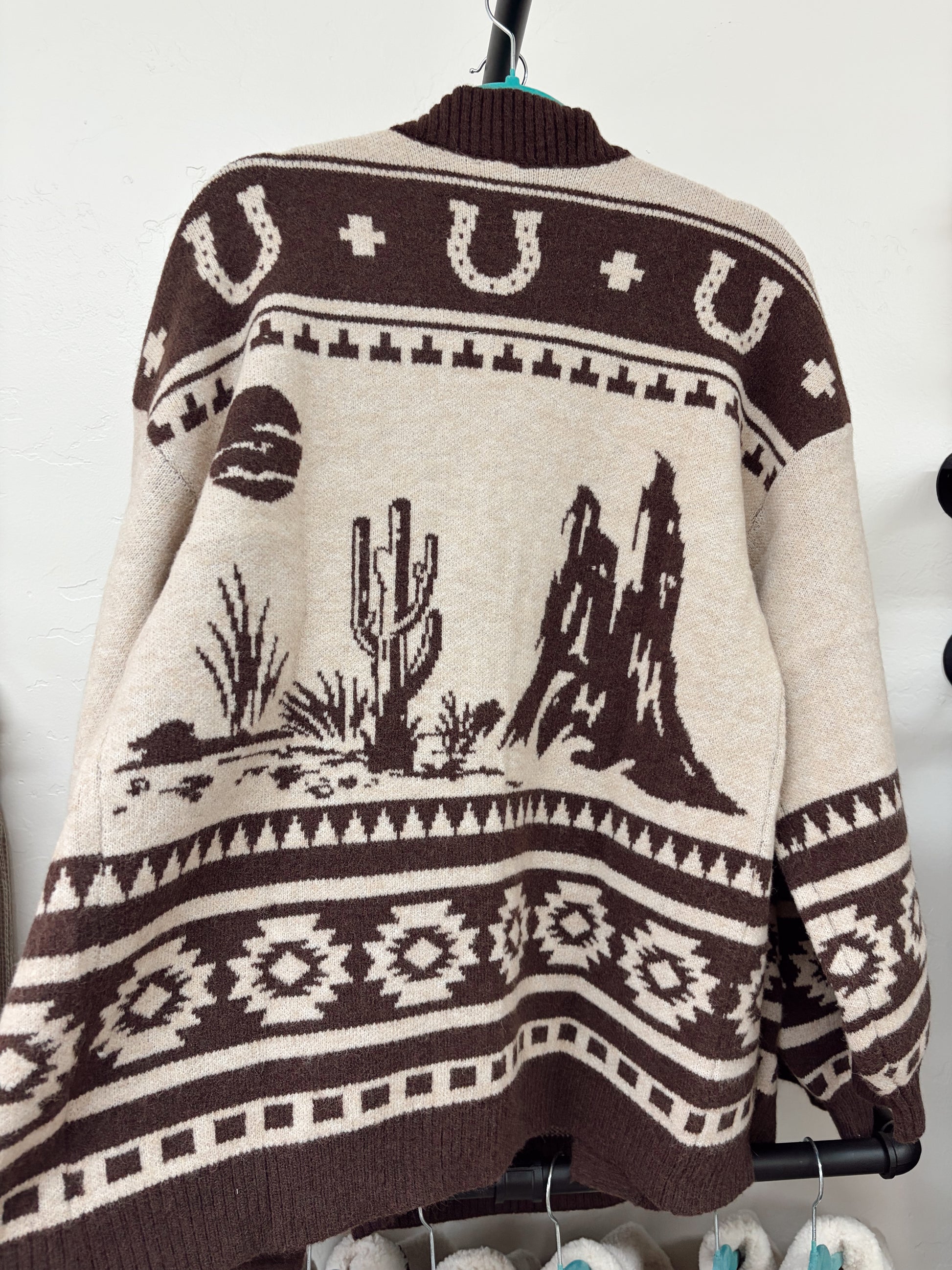 Cozy meets cowgirl in this statement cardigan. Designed with rich mocha and cream tones, this soft knit features bold western-inspired patterns, horse details, and a relaxed, oversized fit that’s perfect for layering. Finished with a deep ribbed trim and classic button front, it’s equal parts statement piece and everyday staple. Pair it with denim and boots for an effortlessly western-chic look.
