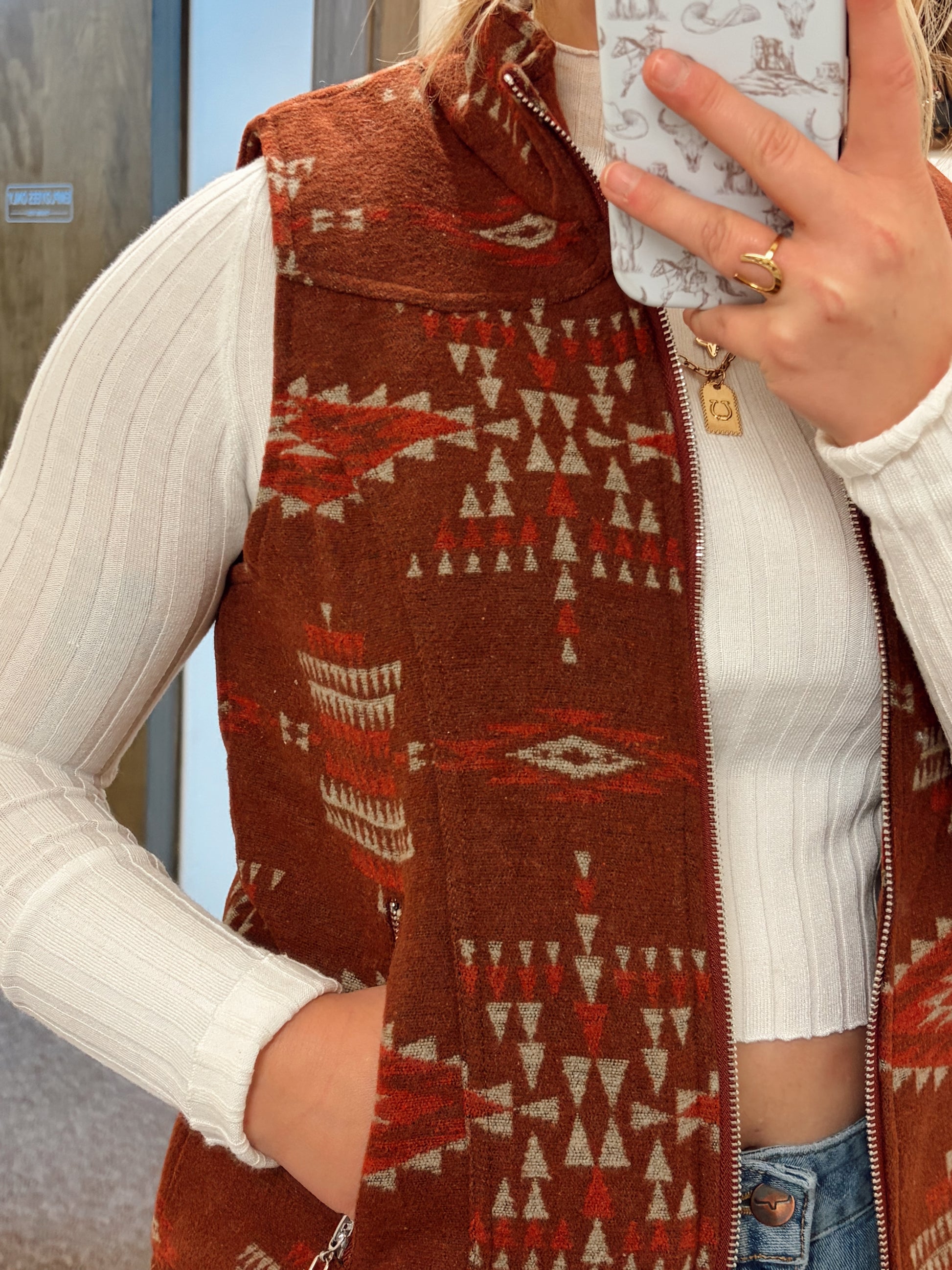 Rich, rustic, and full of western charm. The Ranchland Ember Vest features a warm ember-toned Aztec pattern that brings depth and texture to any outfit. Its soft woven fabric, full zip front, and flattering fit make it the perfect layering piece for cooler days